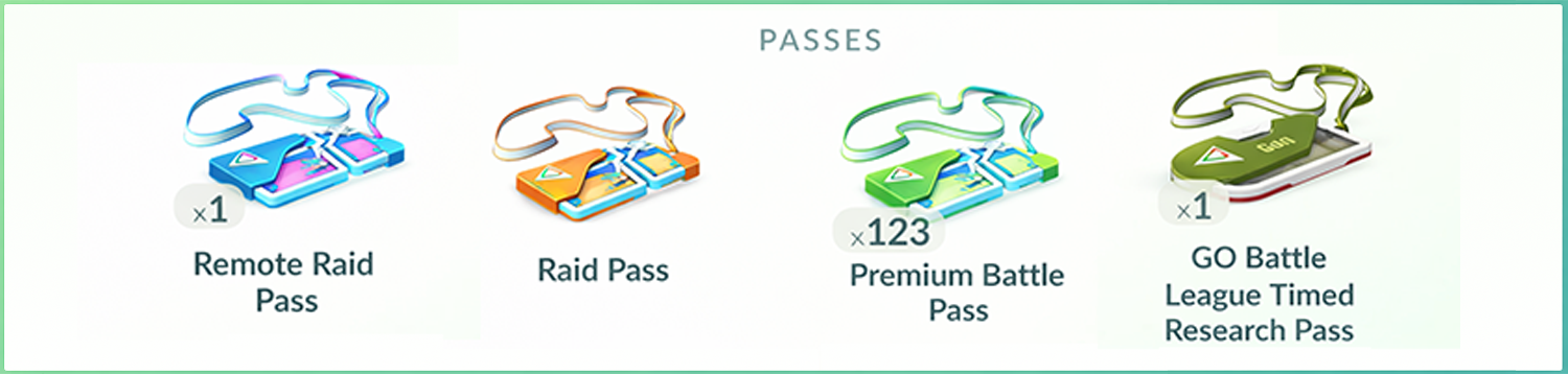 - Premium Battle Pass (Green): Can be used for: • Raiding • Premium track in GO Battle League Do not delete these — they are highly valuable.