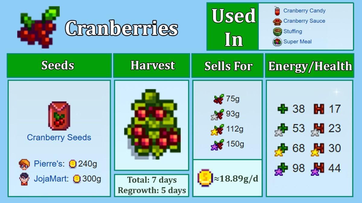Gameplay advantages: Low upkeep, compact layout, and strong compatibility with Preserves Jars (Cranberry Jelly) and Kegs (Cranberry Wine), letting you scale income well into late game.