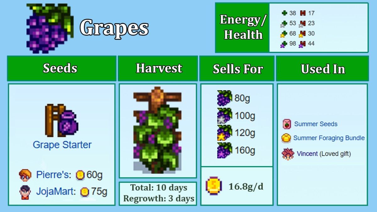 Why they’re great: Grapes mature in 10 days and regrow every 3 days afterward. Their regrowth rate is faster than most regrow crops, giving a steady stream of income during Fall.