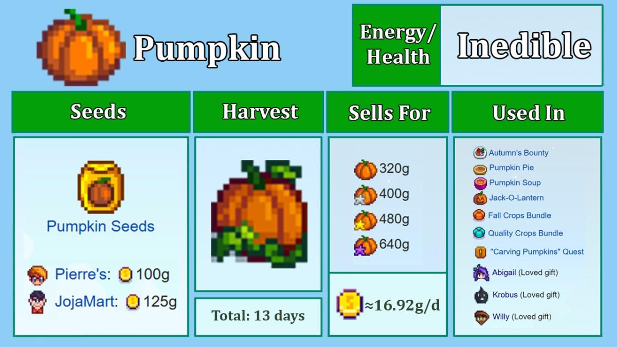 Play tip: Place a 3×3 Pumpkin block early in Fall, keep it watered daily, and do not harvest until the end of the season to increase chances of a giant version forming.